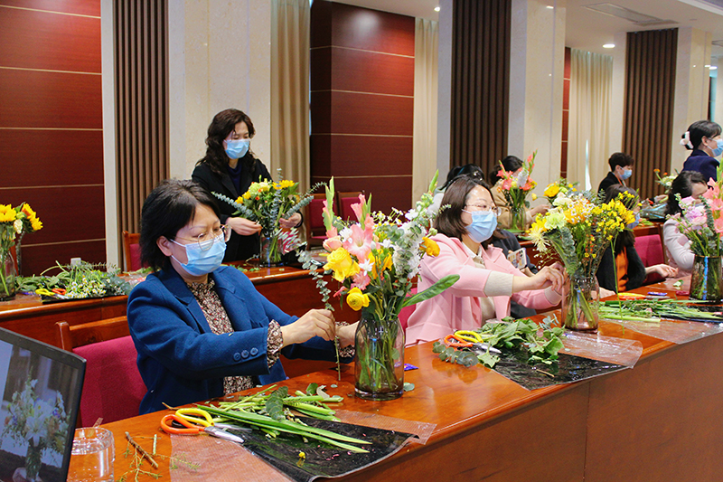 洪山礼堂二号会议厅内花草絮语、芳香四溢。花艺老师为女职工详细讲解了各类花材的特点、插花的基本方法,现场演示色彩搭配、造型修剪等插花技巧。大家充分发挥创造力和想象力,用灵巧的双手创作出一盆盆错落有致,独具匠心的插花作品。